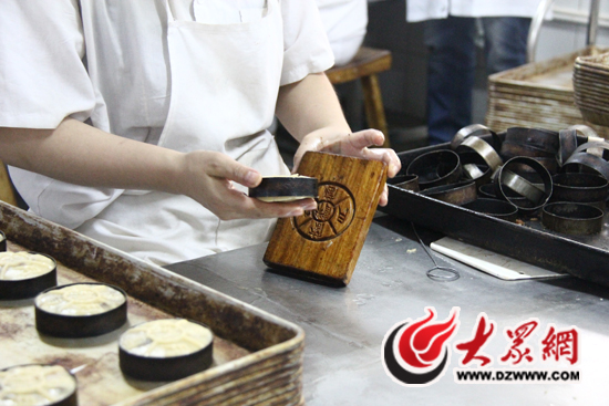 除了餡料制作之外,整個車間同時采用了純手工和機器兩種方法進行月餅的包制。車間的負責人告訴記者,濟南當地風味的“葡萄軟月”月餅現在依舊采用人工包餡,木質磨具成型的方法進行制作,而廣式月餅則已采用機械化流水生產。“手工包是為了體現濟南月餅的老風味,每個月餅都控制在100克左右。手工雖然比不上機器快、規整,但卻是一種文化的體現。”