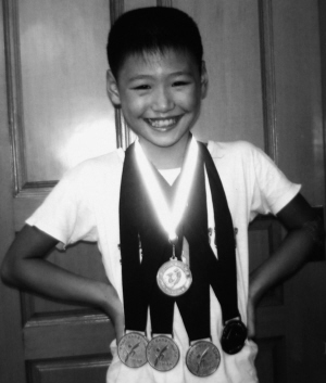 10歲的葉詩文理著短發,脖子上掛滿了金牌,這個時候的她在少兒比賽中拿金牌拿到手軟。