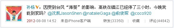 “因受到臺(tái)風(fēng)“?钡挠绊懀哞F在鎮(zhèn)江已經(jīng)停了三小時(shí),今晚我能到家嗎?@沈凱JasonShen @natalieGaga @俞俊琛 @coco920。”這是孫楊今天14:52分發(fā)布的一條微博,從內(nèi)容上可以看出,孫楊今天坐高鐵回家,但無奈遭遇到臺(tái)風(fēng)“?,高鐵被迫在鎮(zhèn)江停留三個(gè)小時(shí),這讓孫楊擔(dān)心能否在今晚順利到家。