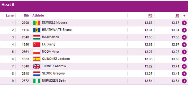 110米欄:劉翔6組4道 與世錦賽冠軍同組