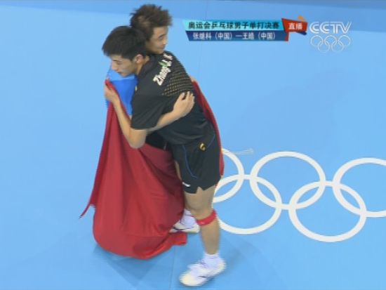 奪取了自己奧運生涯之中的第一枚金牌,恐怕這一刻的榮光讓張繼科永世難忘。奪冠后,張繼科沒有忘記自己的隊友,同樣也是今天決賽場上對手的王皓,只見張繼科與王皓緊緊的擁抱在了一起,然后兩人一起舉起了國旗,這一刻儼然是在向世界宣稱:這是中國的榮譽!接下來,在頒獎授牌儀式中,張繼科在登上冠軍的領獎臺之前又與王皓緊緊的相擁,這是男人之間的擁抱,千言萬語,都不及這肩膀的對撞。