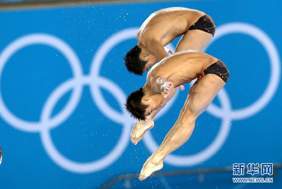2012年7月30日圖為,曹緣(后)/張雁全在比賽中。當(dāng)日,在倫敦奧運(yùn)會男子雙人10米跳臺跳水決賽中,中國組合曹緣/張雁全以486.78分的總成績奪冠。這是中國軍團(tuán)奪得的奧運(yùn)第七金。新華社記者 凡軍 攝