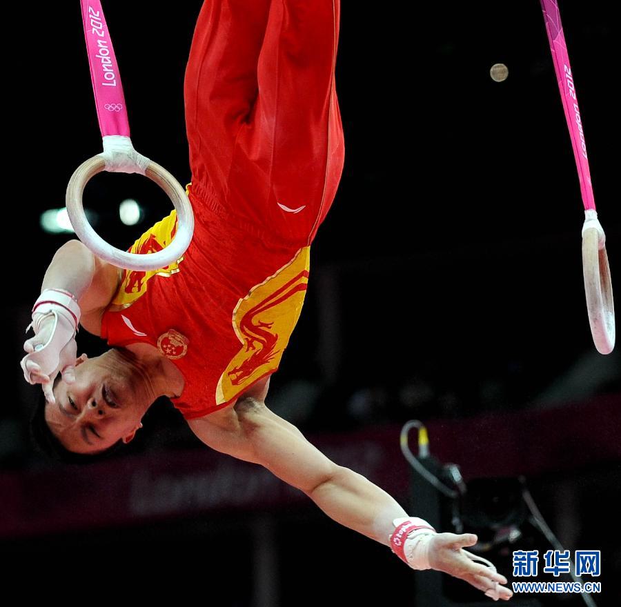 7月30日,中國選手陳一冰在吊環(huán)比賽中。當(dāng)日,在倫敦奧運(yùn)會(huì)體操男子團(tuán)體決賽中,中國隊(duì)獲得冠軍。 新華社記者王建華攝