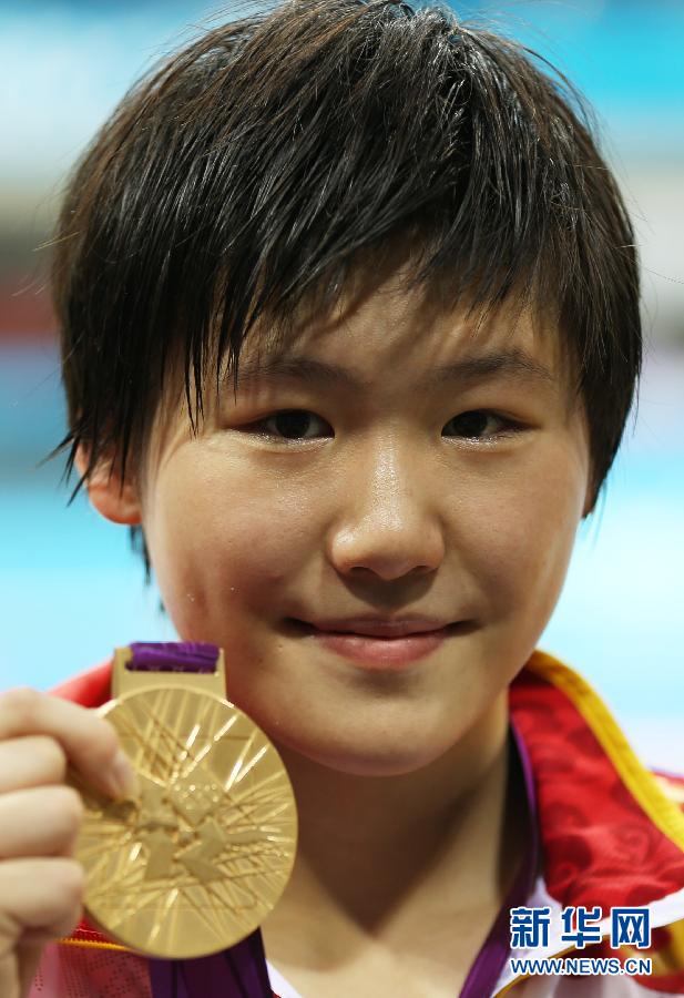 2012年7月31日,在倫敦奧運會游泳女子200米個人混合泳決賽中,中國選手葉詩文以2分07秒57的成績獲得冠軍,并創造新的奧運會紀錄。圖為,葉詩文展示金牌。新華社記者 費茂華 攝