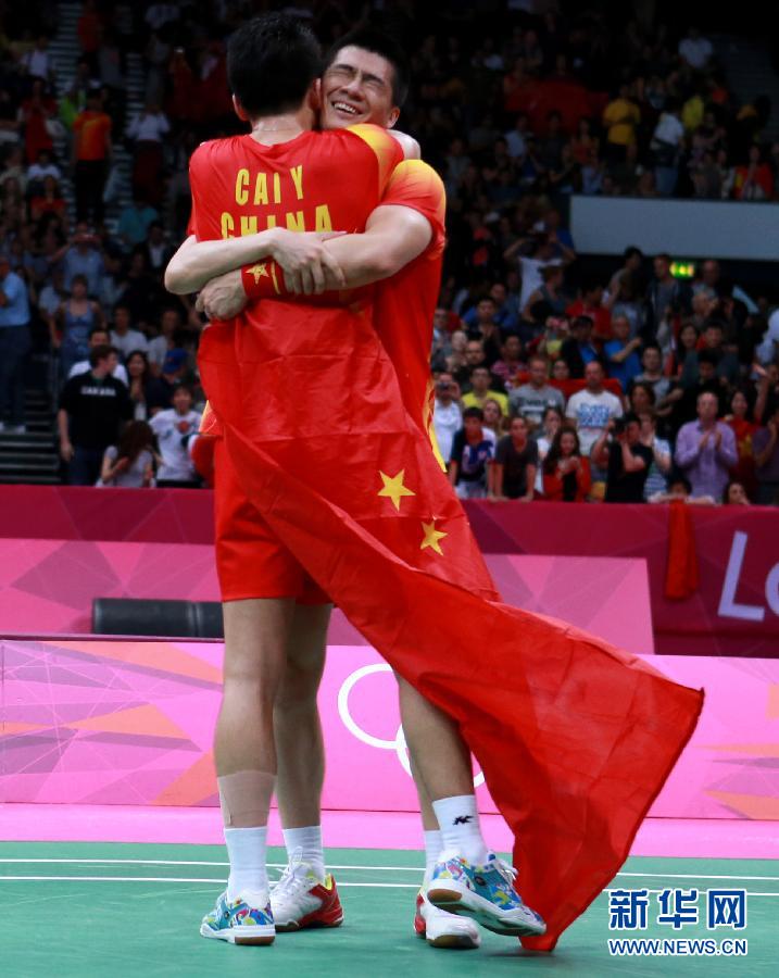 8月5日,蔡赟/傅海峰(右)奪冠后擁抱慶祝。當日,在倫敦奧運會羽毛球男雙決賽中,中國選手蔡赟/傅海峰以2比0戰勝丹麥選手鮑伊/摩根森,獲得冠軍。新華社記者任正來攝