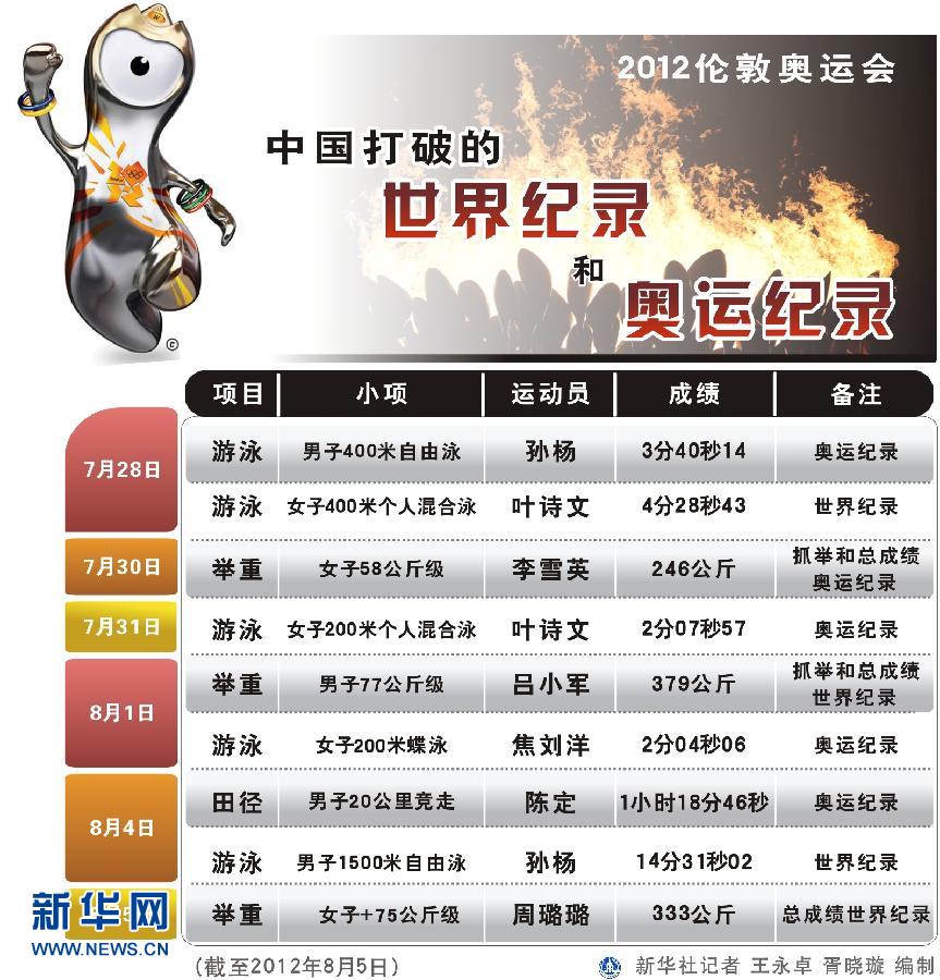 圖表:倫敦奧運會中國打破的世界紀錄和奧運記錄(截至8月5日) 新華社記者 王永卓 胥曉璇 編制