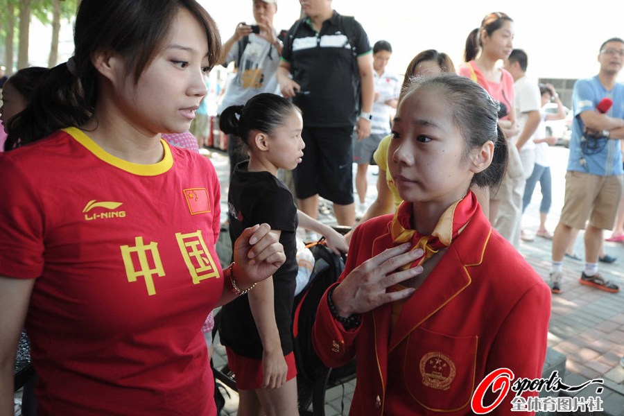 北京時間7月15日,中國國家體操隊離開北京,啟程趕赴倫敦,備戰即將開幕的奧運會比賽。最后時刻因傷未能入選的老將程菲拄著雙拐來到現場,為隊友送行,場面感人。