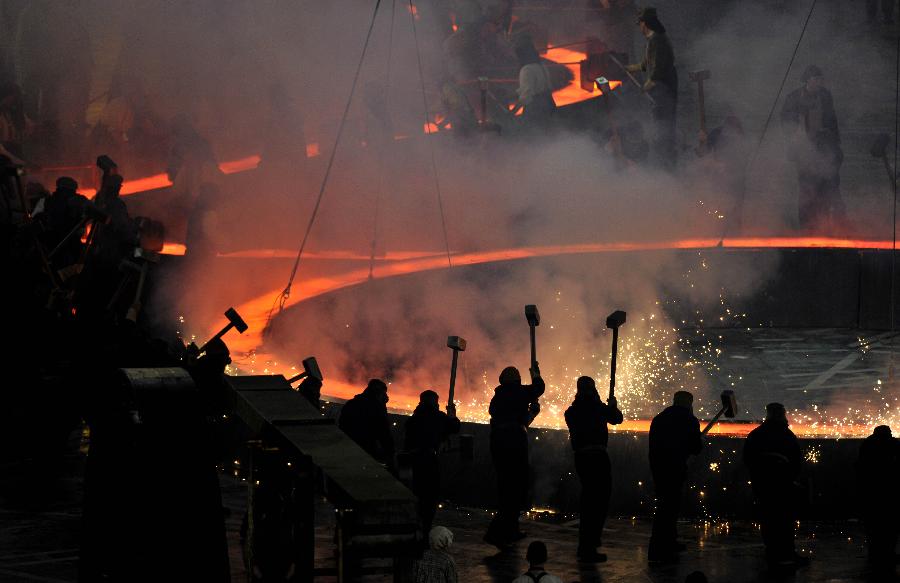 2012年7月27日,第三十屆夏季奧林匹克運動會開幕式在倫敦奧林匹克公園主體育場“倫敦碗”舉行。圖為,開幕式上的文藝表演。 新華社記者 陳曉偉 攝