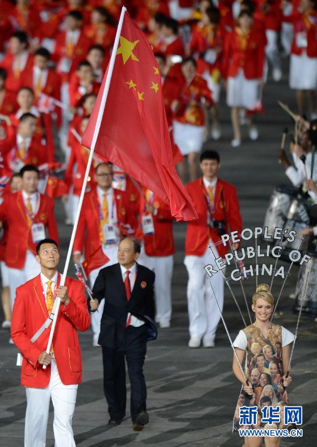 7月27日,第三十屆夏季奧林匹克運(yùn)動會開幕式在倫敦奧林匹克公園主體育場“倫敦碗”舉行。這是中國代表團(tuán)旗手易建聯(lián)(左前)執(zhí)旗入場。新華社記者楊磊攝
