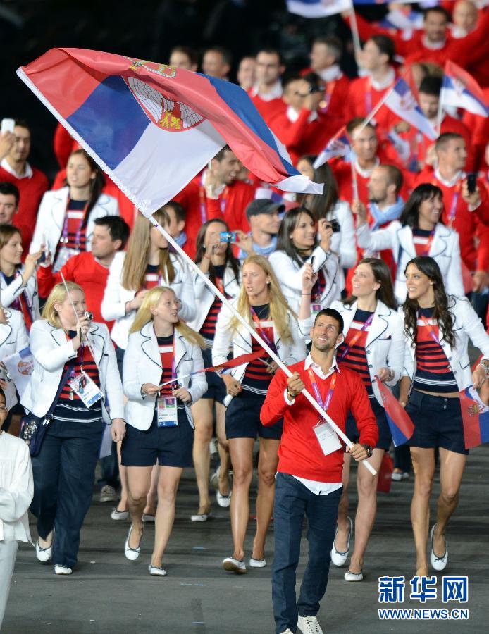 7月27日,第三十屆夏季奧林匹克運動會開幕式在倫敦奧林匹克公園主體育場“倫敦碗”舉行。這是開幕式上,塞爾維亞網球選手焦科維奇(前)執塞爾維亞國旗入場。圖為,焦科維奇執塞爾維亞國旗入場。新華社記者 楊磊 攝