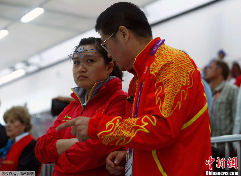 倫敦奧運會射擊比賽,女子10米氣手槍預賽,衛冕冠軍郭文珺打出388環排在第一,蘇玉玲386環列第四,兩人攜手晉級決賽。圖為郭文珺在與教練交流。