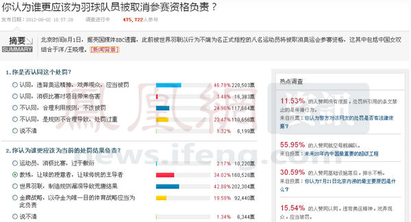 國羽頭號女雙于洋/王曉理因消極比賽被取消奧運資格,關于這個處罰是否適當合理,參與鳳凰網大型民調的網友呈現鮮明的兩極化,支持和反對處罰的幾乎各占50%。50.26%的民調參與者認為,無論何時不能違背奧運精神,所以處罰適當。48.43%的參與者則認為,這是在規則允許的范圍內合理利用規則,或者規則本身有漏洞,非運動員之罪。在另一個調查項目“是否支持將消極比賽作為競賽策略使用”,亦有48.58%的網友支持,但49.62%網友表示反對。