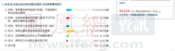 是否可以將消極比賽作為競賽策略使用?鳳凰網民調顯示,48.58%的網友支持將消極比賽作為競賽策略使用,理由有三:一,保存體力是正常的戰術;二、爭取最后勝利的戰術安排,不違背奮斗爭先的奧運精神;三、當規則使得勝利無意義甚至于己不利時,消極比賽有其合理性。但49.62%網友表示反對,首先,消極比賽違背奧林匹克精神;其次,運用策略也應當符合公平競賽的要求;再者,保存實力與消極比賽本質上不同。