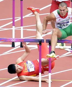 [提要] 北京時間8月7日下午,引人關注的奧運男子110米欄預賽在“倫敦碗”奧林匹克體育場進行。中國飛人劉翔在第六小組中出場,結果在跨越第一個欄的時候就打欄摔倒,在走到球員通道后又折返賽場,在已經(jīng)完成比賽的對手的攙扶下單腿跳向終點。