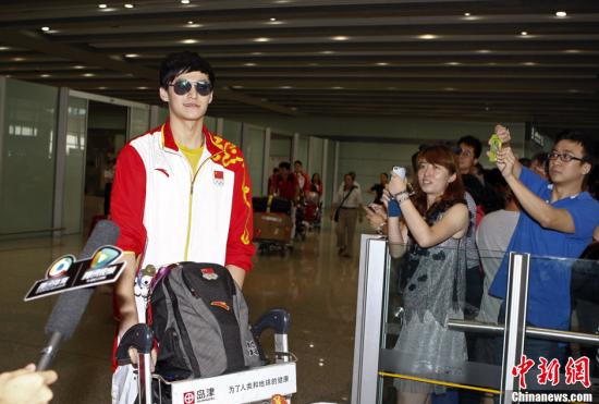 8月6日,倫敦奧運會游泳冠軍孫楊到達首都機場,受到粉絲們的熱捧。中新社發張浩攝
