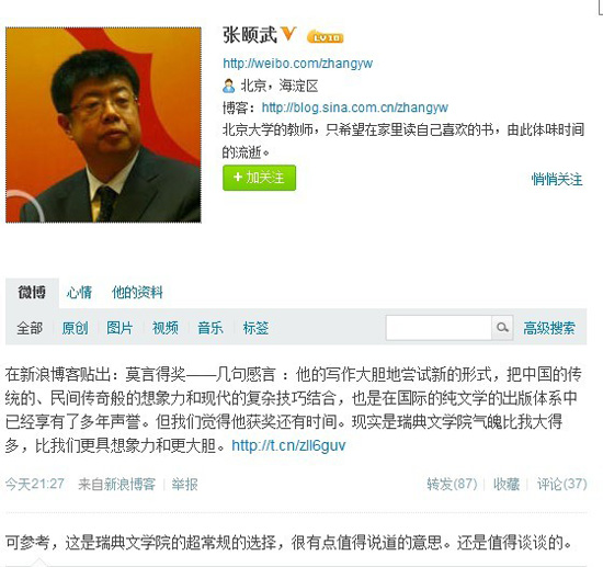 在個人實名認證微博中,張頤武說,莫言的寫作大膽地嘗試新的形式,把中國的傳統的、民間傳奇般的想象力和現代的復雜技巧結合,也是在國際的純文學的出版體系中已經享有了多年聲譽。