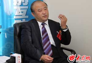 參加省十一屆人大五次會議的省人大代表、萊蕪市委副書記、市長楊宜新在接受大眾網...
