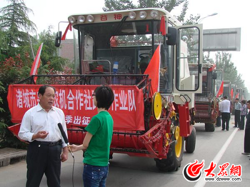 合作社理事長趙佃相帶領(lǐng)跨區(qū)作業(yè)隊出征前接受當(dāng)?shù)仉娨暸_采訪