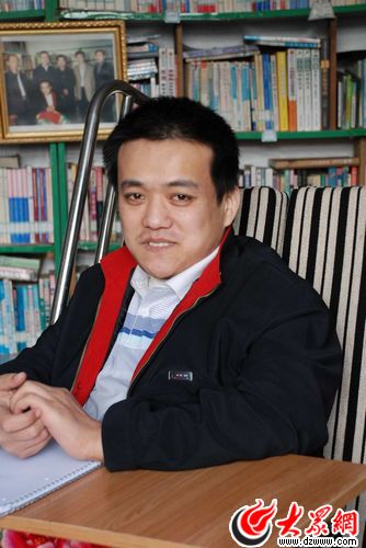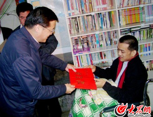 周飛農家書屋是日照市嵐山區后村鎮西草坡村年輕農民周飛2006年創立的。一進門,首先映入眼簾的是書櫥上方墻壁上懸掛的長方形黑框匾額,上面題有“周飛農家書屋讓書香四溢”11個用毛筆書寫的大字。書屋的面積有四五十平方米,共5個書櫥,分別呈“U”字型擺放著,每個書櫥里圖書都塞得滿滿的。這是身體高位截癱、靠輪椅活動的周飛為鄉親們免費提供的“精神家園”。