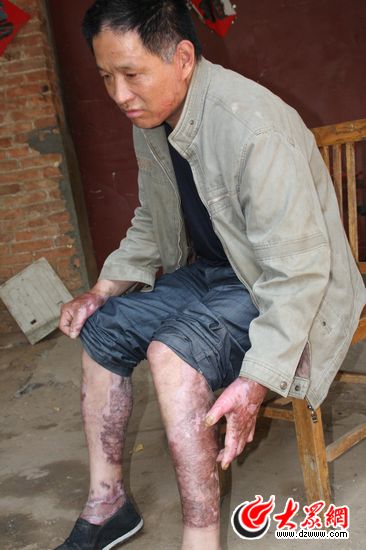 在奮不顧身搶救劉老漢的過程中,沖在前面的劉春虎眉毛全被燒光,上衣和長褲在火苗的吞噬下化為灰燼,僅存的內褲,隨著熊熊烈焰迅速碳化緊緊貼在了胯間。劉春虎沒有意識到,當他把老人抬出屋外時,除去前胸和左手受傷較輕,整個面部和全身70%以上的皮膚被燒毀。在昏迷前的一霎那,劉春虎用手向兩腿部位摸了摸,所觸之處,頓見肉皮紛紛脫落,里面的血漿頃刻涌出……