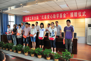 2010年8月,薛城工商分局黨組策劃并設立了薛城工商分局“紅盾愛心捐款助學基金”,成立了組織機構,建立了包括動員捐款、款項管理、對學生的考查、資助方式等內容的捐款助學工作機制。每年8月份,請區教育局提供“準大學生”人員名單,工商分局組成考查小組對學生家庭逐戶走訪調查,然后集體研究確定捐助對象,給予每位貧困家庭學生3000—6000元不等的資助金,隆重舉行捐助儀式,將資助金和生活用品送到每位學生手中,同時給予了學生及其家長精神上的莫大撫慰和激勵。