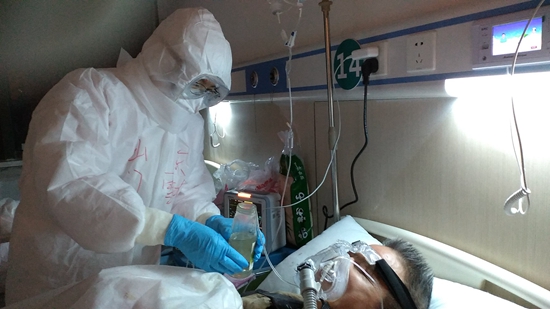 2月24日科室重新組建合并病房,門雪琳醫生進隔離區負責轉運病人。她看到59床大爺忐忑不安地站在走廊里,于是走過去問他還好嗎?大爺一下子聽出門醫生的聲音立馬像找到依靠一樣說:“我有你的電話,可不敢打給你怕影響你休息。你那天解釋后我感覺好多了,我害怕轉科又有重病人我又再加重了。我不知道該給誰說。”門醫生安慰他:“大爺,放心吧!你的擔心我們已經考慮過了,會做安排的。我送您過去。”大爺一遍遍感謝,局促地向伸出手想和門醫生握手可又立即縮了會去,門醫生立即握住大爺的手告訴他他會早日出院的。大爺感動之余又讓周圍人給他們合影,告訴門醫生他要永遠記住她!這樣的事情每天都在發生,和病人交流給患者以信心。