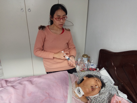 “喉嚨這里的管子每隔兩三個小時就要消毒一次,否則會導致發炎。成人尿不濕戴得久了不透氣,用尿布雖然要洗,但是只要及時更換她會更舒服。每隔一小時喂一次水,吃飯一天要喂五次,一次喂太多她會不舒服。”即使自己身體也不是很好,但這一連串細致、繁瑣的工作,已經成為周穎十幾年來固定的生活模式。