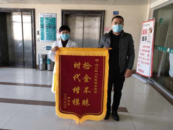 2021年2月5日上午9點多,值了一夜夜班的李翠翠正騎車回家,突然,她發現馬路中央有一個黑色皮包。撿起皮包后,想著失主可能會回來找,她顧不上一夜的勞累,便把電動車停在路邊等候失主回來。但是,直到過了半小時也沒有見到有人來。為盡快聯系到失主,李翠翠決定打開錢包,希望從錢包中找到一些關于失主的信息。經檢查,錢包內不僅有身份證、結婚證、銀行卡、借據等重要證件和資料,還有兩萬余元現金。考慮到皮包里有較多重要的證件和大額的現金,失主必然心急如焚,而自己又無法與失主取得聯系,李翠翠趕忙報了警。恰巧,此時失主也已報警并正趕往銀行辦理掛失手續。接到民警的電話,得知錢包已被好心人撿到,付先生一顆懸著的心終于落了地。此時李翠翠因接到醫院急救電話,已返回醫院加班,得知是李翠翠撿到了自己的錢包,付先生非常希望能當面致謝。付先生和民警迅速趕到醫院,付先生一邊說著感謝的話,一邊拿出部分現金表達感謝之情,但被李翠翠謝絕了。據付先生說,丟失的包中有許多重要證件,其中一張銀行卡里有70余萬元,是待發的農民工工資,如果不能及時找回,那么工人的工資也將無法支付,會直接影響工人們回家過年。民警對李翠翠拾金不昧的行為也表示了高度贊揚。事后心存感激的付先生又專門制作了“拾金不昧,時代楷模”的錦旗,親自送到李翠翠所在的科室,對李翠翠及其科室全體人員表達最誠摯的謝意。