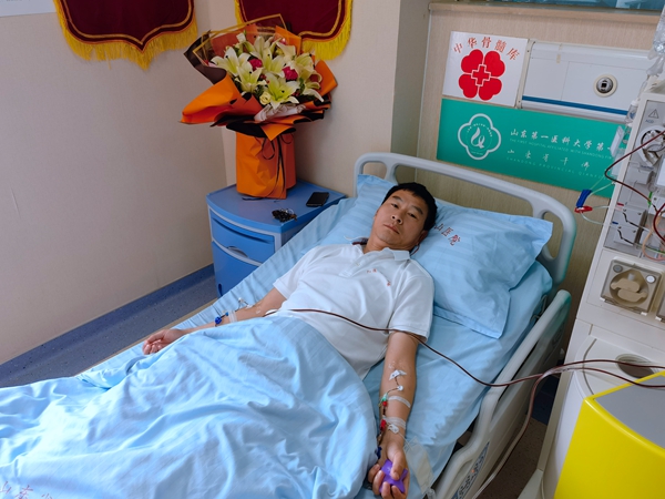 到達(dá)濟(jì)南后,吳跟亭住進(jìn)了千佛山醫(yī)院。準(zhǔn)備階段的前4天,每天早晚需各注射一針動(dòng)員劑,采集當(dāng)天早晨六點(diǎn),吳跟亭注射了最后一針動(dòng)員劑。一名成人的血量約為4—6升,而每個(gè)循環(huán)過(guò)程只能從300ml血液中分離幾毫升的干細(xì)胞,按照吳跟亭的身體條件,他的血液必須在身體和分離機(jī)間完成2.5個(gè)循環(huán),才能分離出足夠的造血干細(xì)胞。采集采用的是雙臂式,整個(gè)過(guò)程需要大約4個(gè)小時(shí),在這4個(gè)小時(shí)中,吳跟亭都不能抬起手臂,但在吳跟亭眼里,比起能幫助別人獲得一次新生的機(jī)會(huì),這算不了什么。吳跟亭表示,他想通過(guò)自己親身經(jīng)歷來(lái)告訴大家,其實(shí)捐獻(xiàn)造血干細(xì)胞是一件非常簡(jiǎn)單但具有重大意義的事,希望能有更多的人加入中華骨髓庫(kù),去挽救更多的生命。