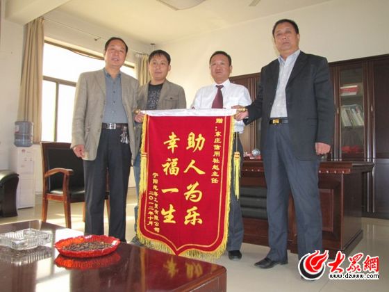 事情過去一個多月后,已經傷愈的車禍受傷者通過個人渠道知道了見義勇為者趙傳喜的姓名及工作單位等信息。11月5日,3名傷者及家屬趕到東莊信用社,將一面繡有“助人為樂、幸福一生”的錦旗親自送給了趙傳喜,并對趙傳喜見義勇為、及時施救的做法表達了感激之情。