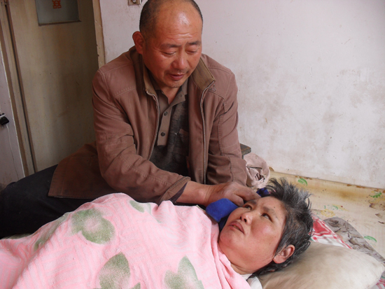 由于天天給妻子按摩,一日三餐都要搬動喂飯,溫培松的胳膊已經累彎了,怎么也伸不直了;麻木的雙手經常握不到一起;腰部也嚴重受損,有時痛得都直不起來……但溫培松從來不舍得去醫院看看,痛了就在藥店買點止痛藥。由于要照料鞠永芳,溫培松沒法外出打工掙錢,只能靠種地掙點錢,再加上鞠永芳一直需要用藥物調理,家里已經一貧如洗。然而最讓溫培松欣慰的是,鞠永芳已經從原來什么反應也沒有,恢復到聽到聲音能轉頭,偶爾還能聽明白一兩句話,嘴唇還會動一動了。