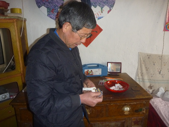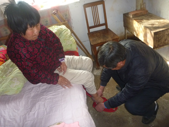 為了照顧妻子,劉萬華放棄了外出打工的機會,僅僅靠家里僅有的二畝多地來維持生計。每天給妻子吃飯、打針、喂藥、清洗臟衣服、幫妻子晾曬被褥,這一晃就是二十多年。由于王福花胳膊無力支撐自己的身體,連翻身都需要劉萬華的幫助,王福花一晚上要翻身20多次,劉萬華總是耐心細致的幫助妻子,從沒有厭煩。為了軟化血管伸展四肢,王福花需要定期打點滴來軟化血管,因為害怕醫療事故的發生,醫生不愿意出診治療,劉萬華便一遍一遍的打電話,甚至登門請醫生到家中為妻子打點滴。由于長時間無法直立行走,妻子王福花的雙腿已經開始萎縮,劉萬華便每天定時幫妻子按摩。如今,60多歲的劉萬華總是要帶上老花鏡才能幫妻子拿藥,因為他害怕給妻子拿錯藥;每次喝藥前他也總是先嘗嘗水溫,怕燙到妻子……劉萬華無微不至的關懷讓妻子的心情漸漸好起來。