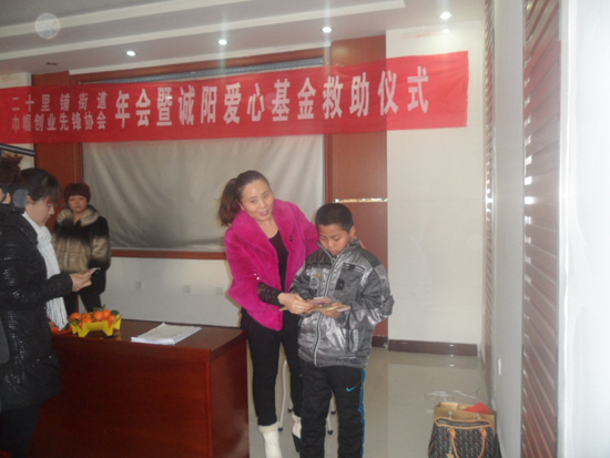2010年二十里鋪街道“誠陽愛心基金”成立暨貧困兒童救助啟動儀式上,李娟捐出了5000元錢;她曾經自費購買幾十箱蛋糕去送到濟寧市社會福利院;也曾經安排貧困家庭的子女到自己的廠里就業。“這樣的孩子,最渴望母愛,渴望被關心,我都像自己的孩子一樣,無法割舍對他們的牽掛。想想孩子們的命運可能因此而改變,我就感到充滿希望,充滿動力,覺得自己的付出有價值。”說起資助貧困兒童,李娟動情地說。