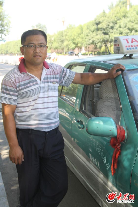 在齊河南來北往的大街上,有一輛出租車右側(cè)后視鏡座上,飄系著一條長長的紅絲帶,特別的顯眼。上了年紀(jì)的人,身有殘疾人,都親切地稱之為“我們的愛心車”,坐上這輛車,就像坐上私家車,的哥不但不收車費(fèi),還虛寒問暖,全心服務(wù),給人一種溫馨的感覺。的哥張建開車幾年來,義務(wù)接送老年人、殘疾人、現(xiàn)役軍人、考試學(xué)生等上千人,搭出車費(fèi)近萬元。因?yàn)樗麡飞坪檬,心地善良,人們都親切地稱他為“愛心的哥”、“大義的哥”。