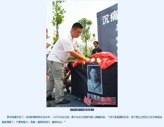 7號上午,尉守剛坐上了前往西安的火車,因為是硬座,天氣又比較炎熱,等他到達西安時,給鞏老師發了這樣一條短信,“太累了”。鞏勝芳回信,讓他休息一下再去天水。沒想到尉守剛還是坐上了前往天水的汽車。“到酒店了,我已經累得走不動了,實在太累了。”這是尉守剛給鞏勝芳發送的最后一條短信。說到這里,鞏勝芳已是泣不成聲。“尉大哥太偉大了,他什么事都先想著孩子們,卻從來不考慮自己,他是一個好人。”鞏勝芳說,她希望尉大哥能夠一路走好。