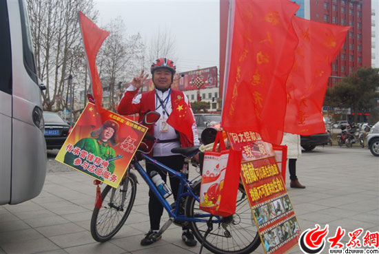 一輛藍(lán)色山地車,前面懸掛學(xué)雷鋒宣傳牌,后面是無(wú)償獻(xiàn)血英雄展板,配上改裝好的擴(kuò)音器……這樣的行頭,無(wú)論走到哪里都會(huì)贏來(lái)很高的回頭率。這輛山地車的主人叫陳成合,今年50歲,是汶上一家飯店的廚師。一共獻(xiàn)血5萬(wàn)余毫升,并騎車義務(wù)宣傳獻(xiàn)血知識(shí),他堅(jiān)持了8年 。