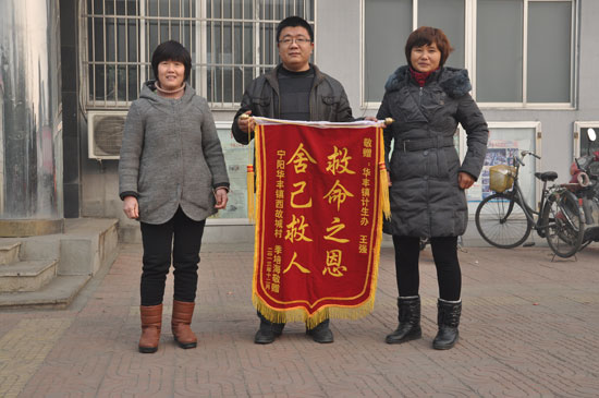 24日一大早,被救孩子的家長來到了華豐鎮政府,向王克珂贈送了印有“舍己救人救命之恩”的錦旗,“感謝他給了俺兒第二次生命”,被救兒童季宗杭的母親喬富玲激動地說。