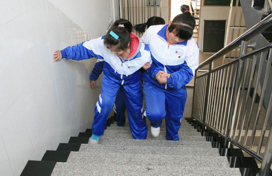 早上起床,張明月都要提前20分鐘起床,洗漱完畢后再幫助張?jiān)炉B被、洗漱,然后扶著張?jiān)聛淼讲蛷d坐下,把倆人的餐具洗好,再把倆人的飯菜買好一起吃。碰到拿不準(zhǔn)張?jiān)孪矚g吃什么的時(shí)候,她就扶著張?jiān)乱黄鸬酱翱谫I。盡管家庭不富裕,她們一般都買最便宜的的飯吃,可是笑聲從來沒在她們的飯桌上消失過。上課了,因?yàn)槭敲@啞孩子,老師提的很多問題需要到黑板前用板書作答,由于張?jiān)聼o法站立書寫,一開始老師都盡量不提問她。張明月就向老師提出,盡管提問張?jiān)拢约嚎梢苑鏊龝鴮懀还芏嚅L時(shí)間。當(dāng)她看到張?jiān)禄卮鹫_時(shí),就會(huì)由衷地替她高興。下課了,張?jiān)乱蠋瑥埫髟戮团惆橹黄鹑ァ堅(jiān)麦w力有限,課間除了上廁所,都是坐在教室的座位上,張明月就放棄玩耍,陪她說笑。盡管行動(dòng)不便,張?jiān)聟s很喜歡上體育課,因?yàn)閺埫髟聲?huì)陪著她拍球、做仰臥起坐……。