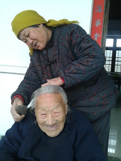 黃慶愛是顏莊鎮野虎溝村一位103歲老人,老人年輕時老伴就已去世,唯一的女兒也因病早早過世。三口之家,早就只剩她一個人。史能菊,原本是老人的侄媳婦,因為史能菊的丈夫吳會茂過繼給了黃慶愛。這稱呼也由“大娘”變成了“娘”。1971年,21歲的史能菊嫁給了野虎溝的吳會茂。從嫁進家門的第一天起,史能菊不僅要照顧自己的公公、婆婆,還要照顧“大娘”黃慶愛。剛進門不長時間,老人就得了肝硬化,肚子鼓得像個皮球。吳會茂和史能菊帶著黃慶愛四處求醫,得到的答案幾乎一致——— “放棄治療”。史能菊死活不甘心,“俺不認字,就認死理,難道就推回家等死?”她四處托人找偏方,沒想到黃慶愛在吃了她找的偏方后,竟然奇跡般地活了過來。