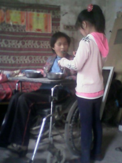 苗苗的母親癱瘓,生活無法自理,父親于五年前因心臟病發去世,家里還有73歲的奶奶和104歲的老奶奶。生活的重擔全部落在了這個7歲女孩的身上。從此柴米油鹽,洗衣做飯,她用羸弱的身軀,維系著這個支離破碎的家。五年如一日,苗苗晚上經常和衣而睡,一聽到媽媽有動靜就馬上起床照顧媽媽。每天天剛亮,苗苗就起來照顧媽媽起床洗漱。起床對于一般人來說是再平常不過的事,但對于苗苗的媽媽來說,卻異常艱難,全靠苗苗的幫助才能完成。由于苗苗力氣小,必須得趴在床上才能一步步把媽媽挪到輪椅上。一天又一天,一年又一年,李苗苗就是這樣照顧著癱瘓的媽媽。