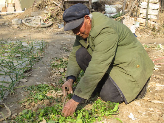 邢文漢在自己的二分地上,種了點白菜和大蒜。為了不麻煩親戚,他硬是忍著疼,跪在地上一點點用角鋤刨坑種菜,跪著給菜蓋上塑料薄膜。“兩行地得一天弄完,我自己能干的事就不麻煩別人。”邢文漢說。就是這樣一位貧困的獨居老人,卻做出了一件不平凡的事兒。