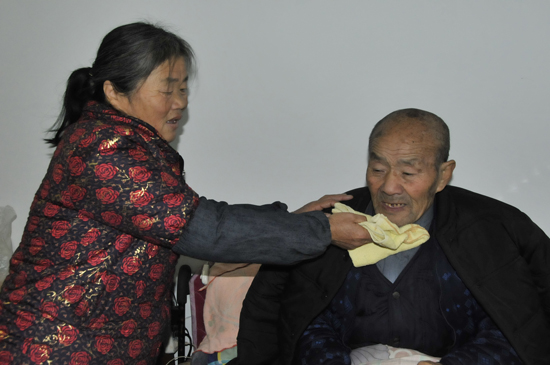 將賈孟光換下來的被褥和衣服洗凈曬到外面后,李玉梅又給老人喂下藥,并幫助他翻身休息。面對筆者,賈孟光幸福地說:“玉梅照顧我比閨女還周到。要不是她,我早就‘摸到閻王鼻子’啦。”