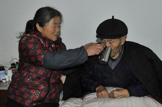 將賈孟光換下來的被褥和衣服洗凈曬到外面后,李玉梅又給老人喂下藥,并幫助他翻身休息。面對筆者,賈孟光幸福地說:"玉梅照顧我比閨女還周到。要不是她,我早就'摸到閻王鼻子'啦。"