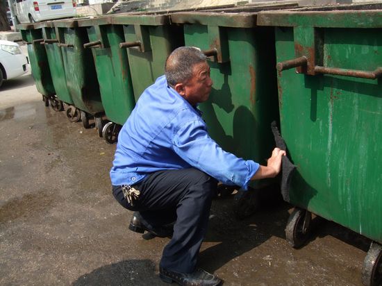 由于保潔工作性質特殊,他經常是費了好大勁把箱體刷凈,把地面掃干凈,前腳還沒走遠,后腳又給丟了一地垃圾,只能重新回來清掃。趙慶武告訴筆者,有一次,他剛剛清掃完一組垃圾箱,還沒等他直起腰來,"吧唧"一聲,從天而降一大包垃圾,連湯帶水地砸在他的后背上,衣服都被湯水濕透了。筆者問,有沒有感到委屈。趙慶武只給了筆者一句話"總有一天人們會理解的。"
