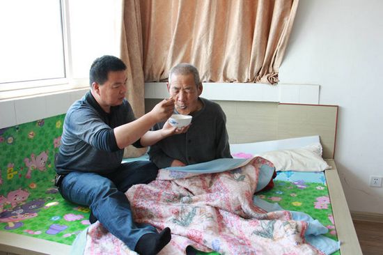 老人由于長期臥床,食欲不好,王勇就給老人變著花樣的做一些水餃、肉丸、蛋羹、豆?jié){、牛奶、雞湯、細(xì)面條等可口、易嚼、易消化而富有營養(yǎng)的食物。每次給老人喂飯,他都要等飯不冷不熱了才一口一口的、不急不躁的喂他,怕太熱燙著他,過快嗆著他。