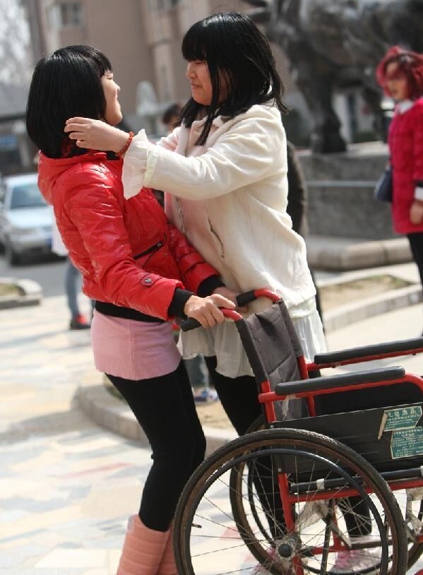 10年前,12歲的姜梅霞在芝罘區支農里社區居住,一天放學路上,她看見一位像她這么大的同齡女孩在離她不遠處摔倒了,姜梅霞就急速地跑過去把女孩扶了起來。看見女孩腿腳不方便,姜梅霞就扶著女孩,把女孩一步一步地送回了家。摔倒的女孩就是劉曉輝,當年14歲,患有先天性腦癱。兩個女孩相識后很快成了好姐妹。姜梅霞教劉曉輝學拼音、學認字,看到劉曉輝需要照顧,姜梅霞就自告奮勇,為劉曉輝當起另一條腿,一晃就是10年時間。10年來,姜梅霞不離不棄,幫助劉曉輝進行戶外鍛煉,讓她嘗試推輪椅載人,鍛煉臂力。劉曉輝終于站立起來了,路能走了,手也越來越有勁,字也認識了許多,自理程度已經與從前判若兩人。因為劉曉輝身體重度殘疾,一些生活起居不能得到完全自理,姜梅霞記在心上。姜梅霞教劉曉輝學會了做飯炒菜、穿衣洗漱,每個周末,姜梅霞為劉曉輝洗澡、洗頭,雷打不動。