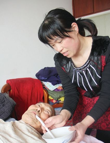 今年41歲的鄧愛(ài)敏雖然看上去很瘦弱, 做起事來(lái)卻特別干練。喂飯、喂水、擦洗身子、按摩、換洗被褥……鄧愛(ài)敏每天都像做功課一樣,一樣不落地照顧著公公。與此同時(shí),她的丈夫和婆婆也有病在身,生活雖能自理,但平時(shí)還需要她精心照料。
