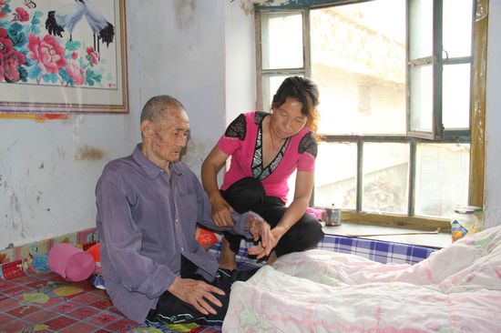 剛結(jié)婚兩個(gè)月,姜振軍95歲的養(yǎng)父因?yàn)橥饶_不便摔了一跤,造成下肢癱瘓,因其年歲太高,醫(yī)院也無能為力。為了照顧養(yǎng)父,王芳辭去工作,整天在家侍候照顧老人。王芳與丈夫的住房與養(yǎng)父比鄰而居,兩家都是三間老房子,分別都是只有一鋪炕。為了照顧養(yǎng)父方便,剛結(jié)婚兩個(gè)月的王芳,就和丈夫一起住進(jìn)了養(yǎng)父的家,與養(yǎng)父三人同睡在一鋪炕上。晚上,她和丈夫一起照顧老人大小便,從不嫌臟嫌累,吃住都在老人家里,這一住就是兩年。等養(yǎng)父的病情有所緩和之后,她才在丈夫的勸說下回到自己家里睡,但白天,怕老人寂寞,她都在養(yǎng)父家里,悉心照顧老人,給老人接屎接尿,做飯洗衣,就連吃飯也是和老人在一起吃,從無怨言。至今已經(jīng)四年,老人從未生過褥瘡,生活的和樂而幸福。癱瘓已四年的姜遠(yuǎn)德老人,一提起王芳就嘮叨說:"沒想到我老運(yùn)這么好,攤上個(gè)好媳婦,要不我這把老骨頭早不在了。"