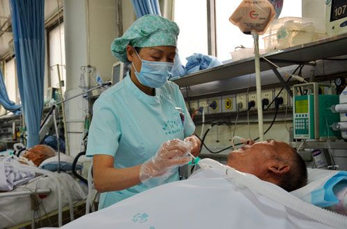 依靠多年的經驗,李秀梅懂得在病人脆弱的時候,適當的安慰有時會起到很大的作用,在監護室內,只要有患者意識清醒,她便過去與患者交流,為患者加油鼓勁兒,記者看到,李秀梅緊握患者的雙手,在患者耳邊輕輕地說了幾句,患者雖已說不出話,但伸出了大拇指來回應她,此時此刻,在一旁的人們無不為之動容。李秀梅說"重癥科里有很多老人,有時候他們就像個孩子一樣,也會耍耍小脾氣,這時候需要我們護士給他們更多的安慰和鼓勵,用心去呵護他們。"