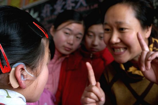為了讓學(xué)生讀準(zhǔn)一個字母,她常常讀幾十遍,上百遍,累得口干舌燥,臉部肌肉酸痛難忍?墒,當(dāng)聽到學(xué)生準(zhǔn)確地讀出一個字母時,她激動萬分;當(dāng)看到學(xué)生對著自己的父母,喊出“爸爸、媽媽”,父母喜極而泣時,她內(nèi)心升騰出強烈的自豪感。那一刻,所有的勞累、委屈都煙消云散。寫作對于聽障孩子更是難上加難,由于他們聽不見人們的話,與同學(xué)交流也不按正常語序說話,因此寫出的句子顛三倒四。為了提高孩子的寫作能力,她堅持指導(dǎo)他們按規(guī)范的語序“說話”,寫日記。為學(xué)生批改日記,是一項費時費力的工作,需要一個詞一個詞,一句話一句話地糾正。經(jīng)過持之以恒的不懈努力,學(xué)生作文也曾在電視報上登載過。